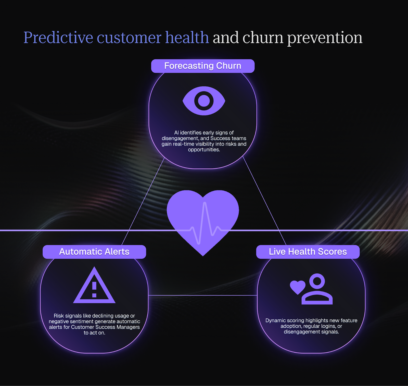 Predictive customer health means using AI to spot early signs of churn or disengagement before they become a problem. Instead of waiting for customers to cancel or complain, AI gives success teams real‑time visibility into risk and opportunities, so they can act proactively.