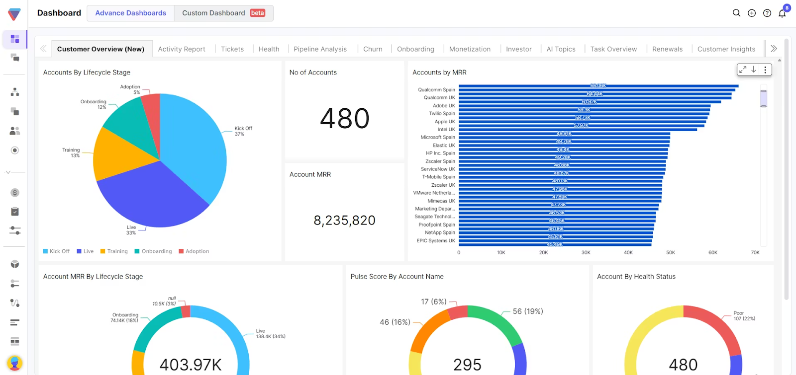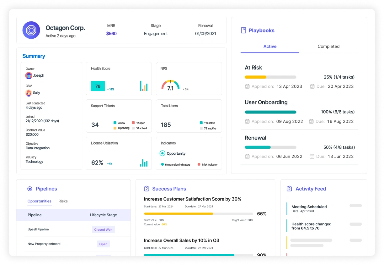 CSPs are designed specifically for customer success. Tools like Velaris, Gainsight, and Totango track health scores, product usage, and engagement in real time. They help teams spot churn risks, identify upsell opportunities, and align reporting with customer journey stages. The main advantage is their focus on retention and growth.