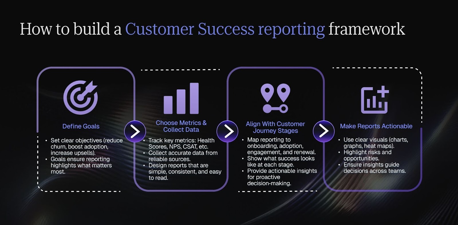 Finally, connect the framework to customer journey stages. From onboarding to renewal, reports should show what success looks like at each step. This alignment helps teams deliver value at the right time and guide customers toward long‑term growth.