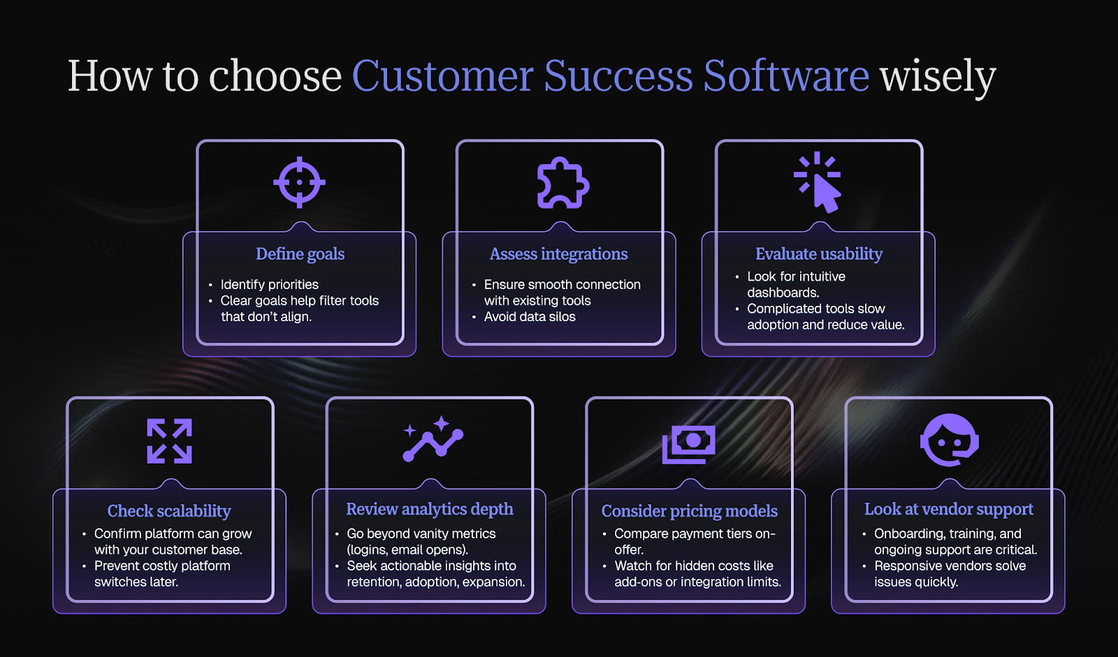The best way to choose customer success software is to match the platform to your business goals, ensure it integrates with your existing systems, and confirm it can scale as your customer base grows. A step‑by‑step approach makes the decision easier and more effective.