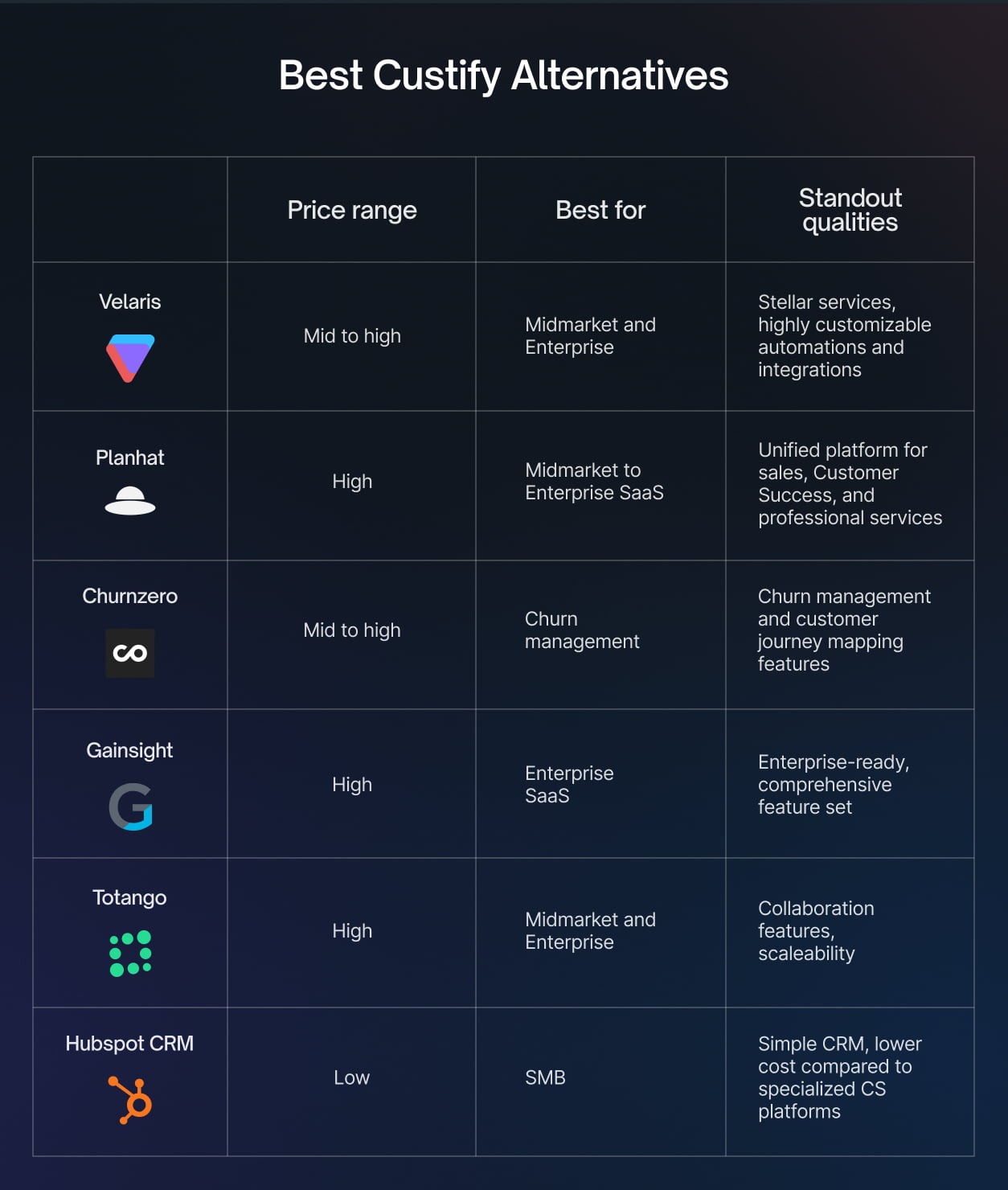 Mid-market SaaS companies often look for platforms that balance scalability and usability. Velaris and Totango are commonly suited for scaling teams, while Planhat can work well for cross-functional organizations.