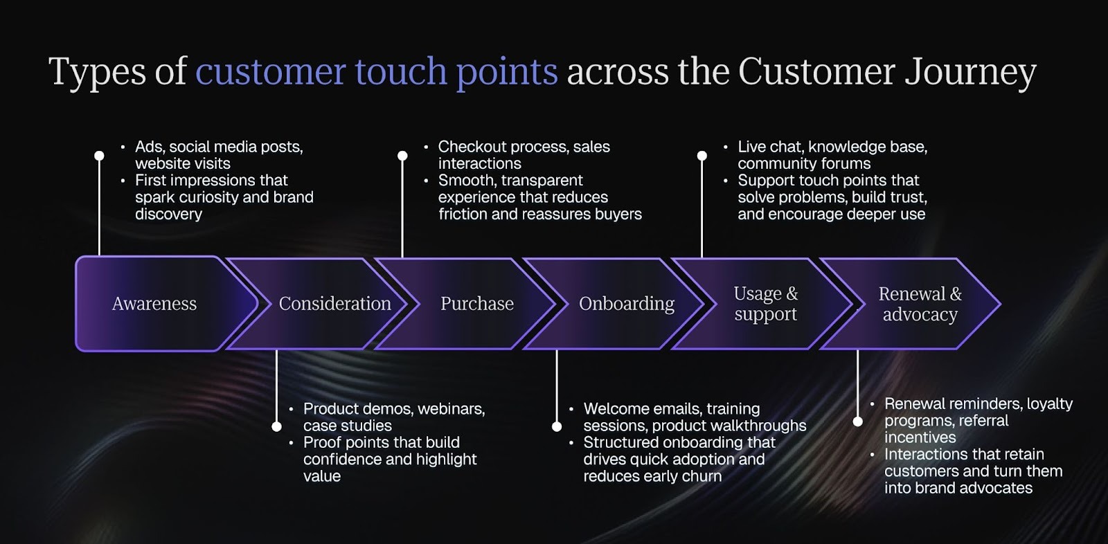 Customer touchpoints are the interactions customers have with your brand at each stage of their journey. They start with awareness through ads, social media, and websites, move to consideration with demos and case studies, continue to purchase via checkout and sales, then onboarding through welcome emails and walkthroughs. In usage and support, customers rely on chat, knowledge bases, and forums, and finally at renewal and advocacy, reminders, loyalty programs, and referrals drive retention and promotion.