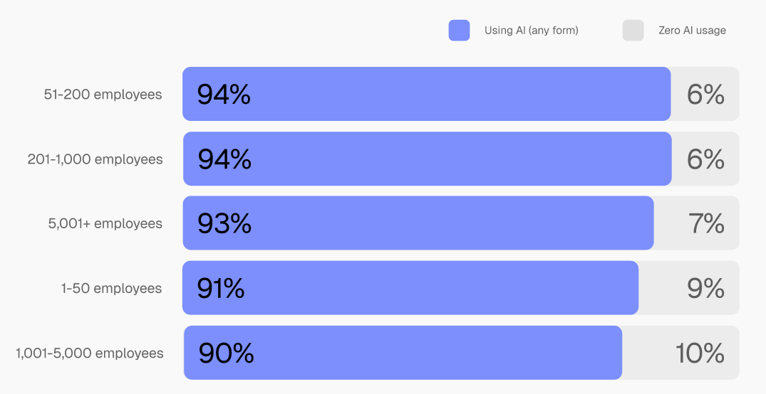 AI adoption seems more or less universal already. 94.8% of respondents report using AI in some form, with only a small minority, 5.2%, not using it at all. What’s more interesting is how consistent this is across the board. Whether it’s a small team or a large enterprise, adoption rates sit within a very narrow range.
