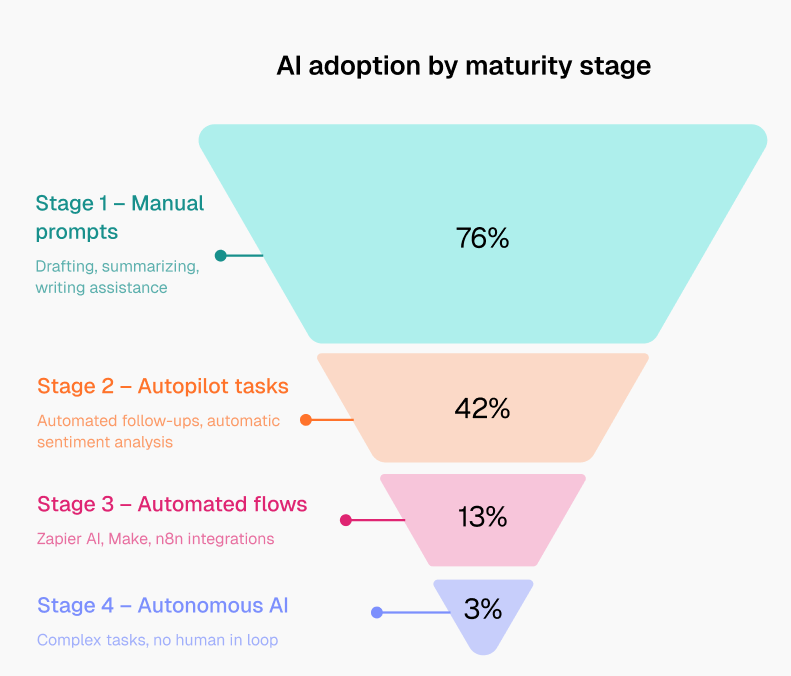 Only a smaller portion of teams have moved into more structured use. Roughly 13% are using AI within workflow automation, and just 3% report using it in more autonomous ways. In other words, most teams are still interacting with AI one task at a time.