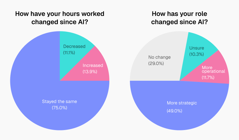 Where the impact is clearer is in how the role itself is evolving. 49% of CS professionals say their role has become more strategic since adopting AI. At the same time, most report that their working hours haven’t changed significantly.