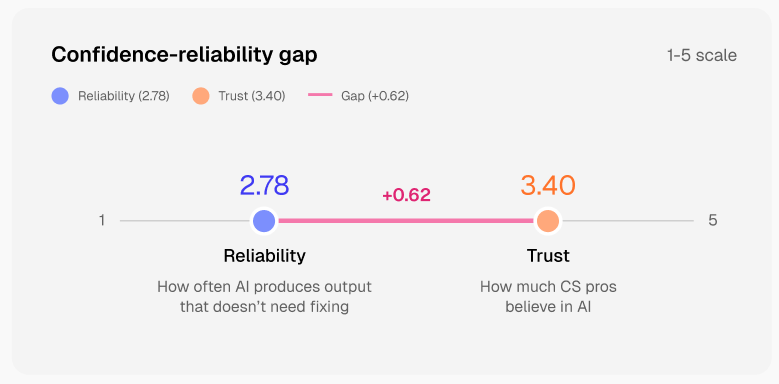 CS teams are getting more comfortable using AI, but that confidence isn’t fully matched by how reliable the outputs are. On average, trust in AI sits at 3.40 out of 5, while reliability is lower at 2.78.