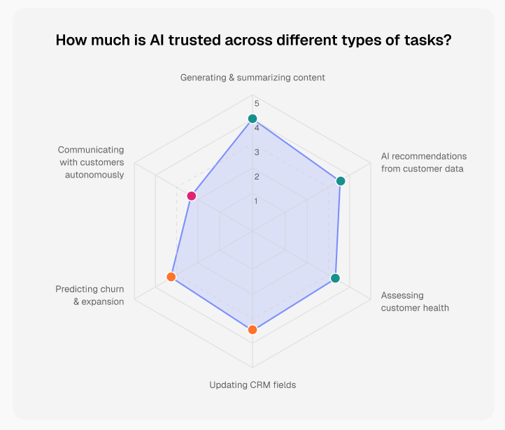 But whenever AI moves closer to decision-making, trust plummets. Areas like assessing customer health, predicting churn, or handling customer communication autonomously carry more weight. The cost of getting those wrong is higher, so teams are more cautious.