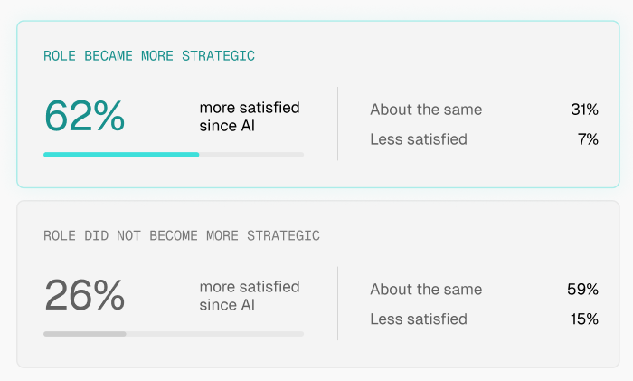 This shift has a direct impact on how people feel about their roles. Those who report moving into more strategic work are 2.4 times more likely to be satisfied. The same is true for teams using AI in more structured ways, particularly those that have moved beyond one-off prompts into some level of automation.