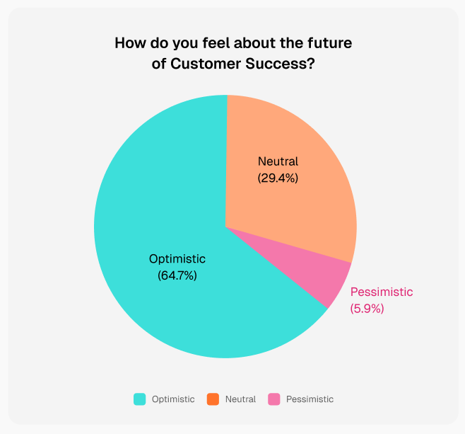 Despite the uncertainty around AI, the overall sentiment in Customer Success is positive. 64% of respondents say they feel optimistic about the future of the role, while only 6% describe themselves as pessimistic.
