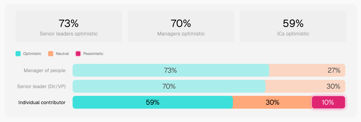 73% of senior leaders tend to be more optimistic and report higher levels of trust in AI. Individual contributors are more cautious, with only 59% expressing optimism. They’re the ones interacting with the outputs directly, fixing inaccuracies, and dealing with edge cases that don’t always show up at a higher level.