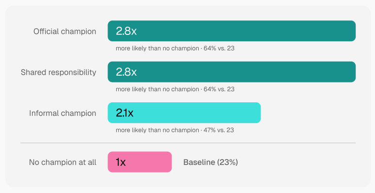 One of the clearest signals in the data is the impact of ownership. Teams that have a defined AI champion, whether formal or informal, are 2.8 times more likely to report a shift toward more strategic work.