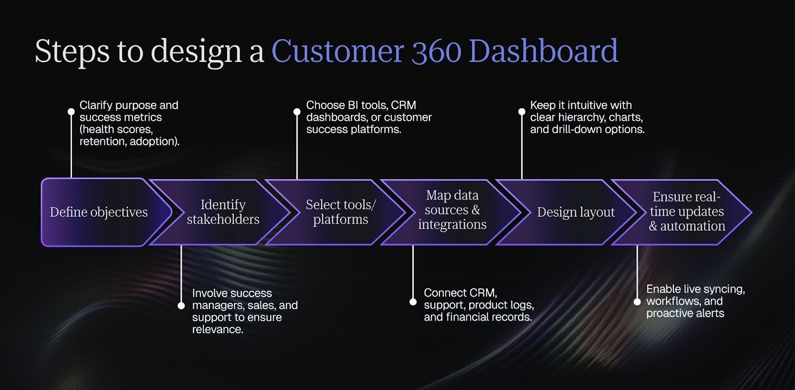 Designing a customer 360 dashboard requires a structured approach that ensures the right objectives, stakeholders, tools, and integrations are in place. By following clear steps, businesses can build dashboards that are user-friendly, accurate, and capable of delivering real-time insights for customer success teams.