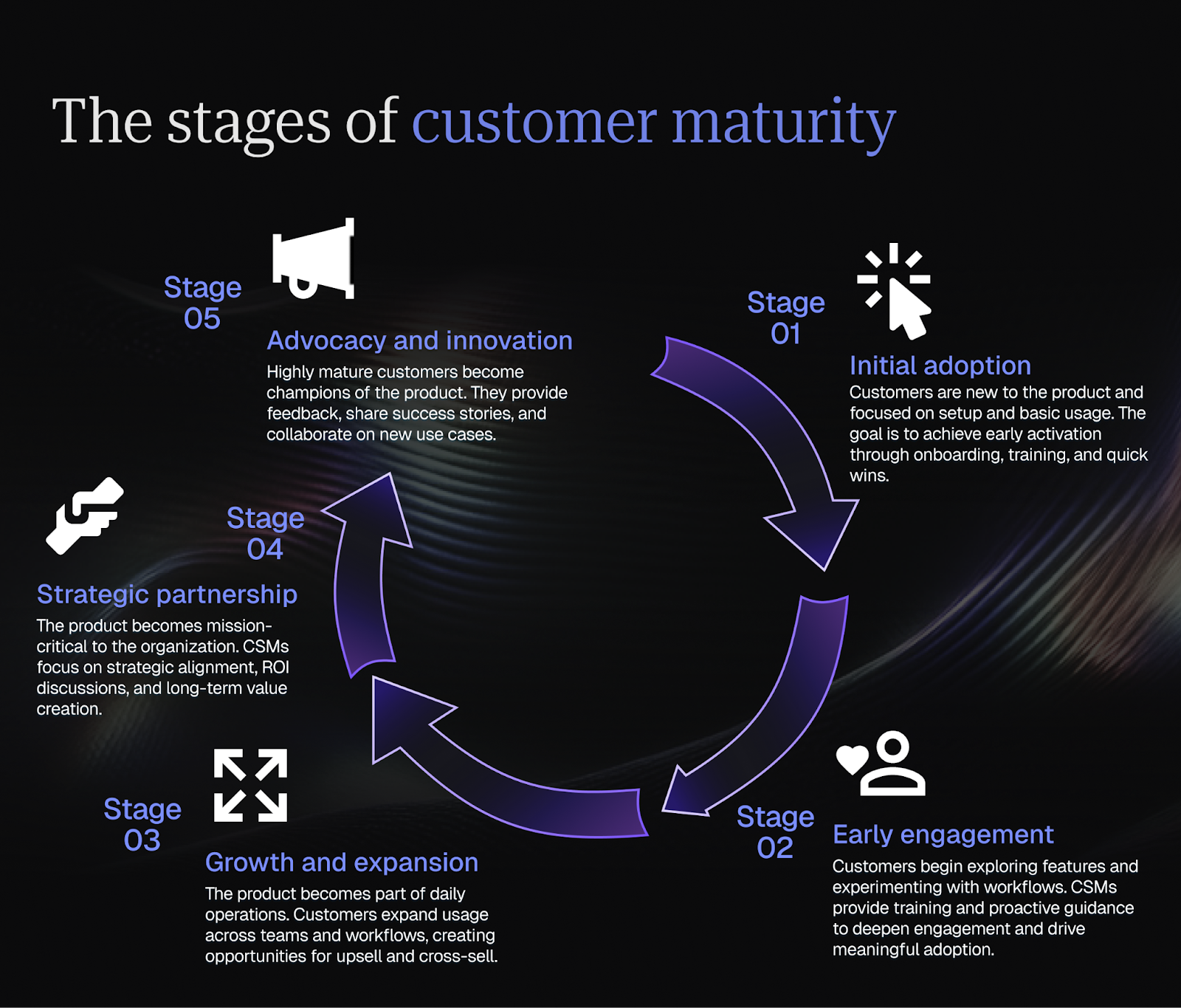 The model helps CSMs tailor their engagement strategies based on where customers are in their journey. Instead of treating all customers the same, CSMs can provide guidance that supports each stage of adoption and helps customers progress toward deeper value.
