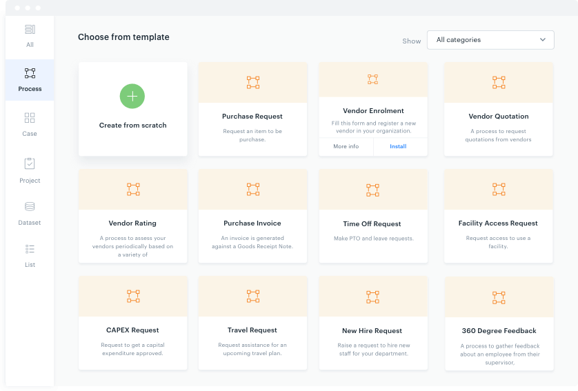 Kissflow’s user-friendly interface ensures that teams of all sizes can leverage its capabilities without extensive training. It also uses a low-code approach, meaning that it focuses on visual tools and custom scripting to automate, reducing the level of coding proficiency required.